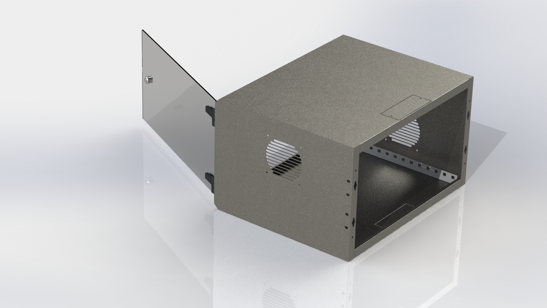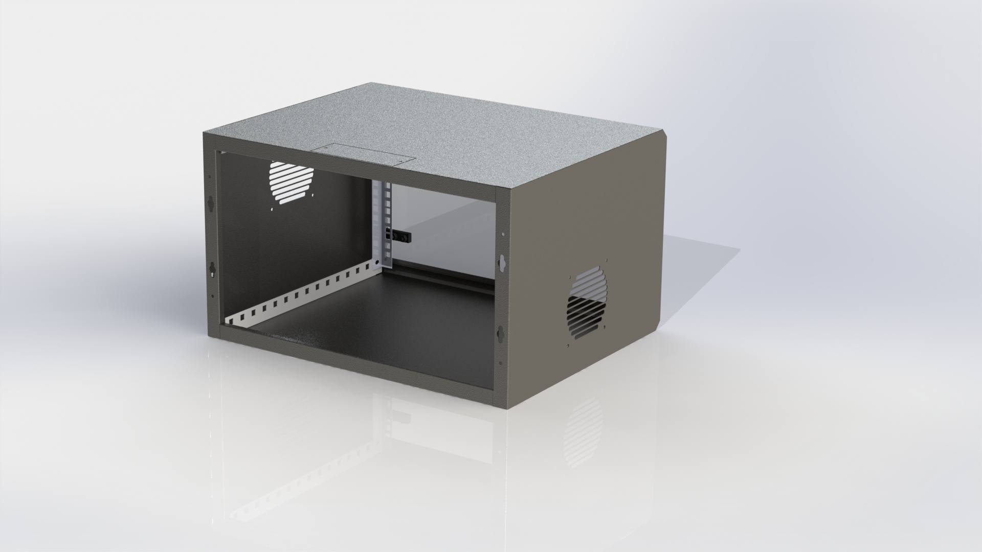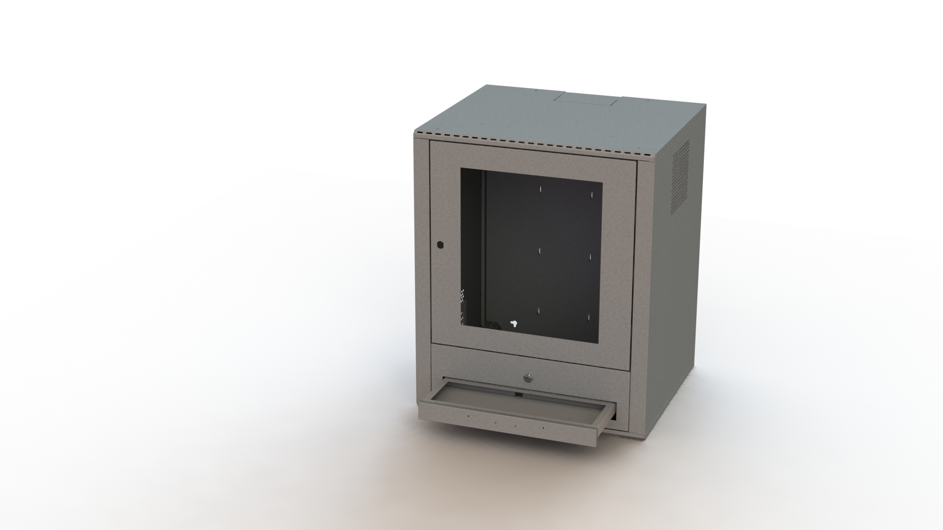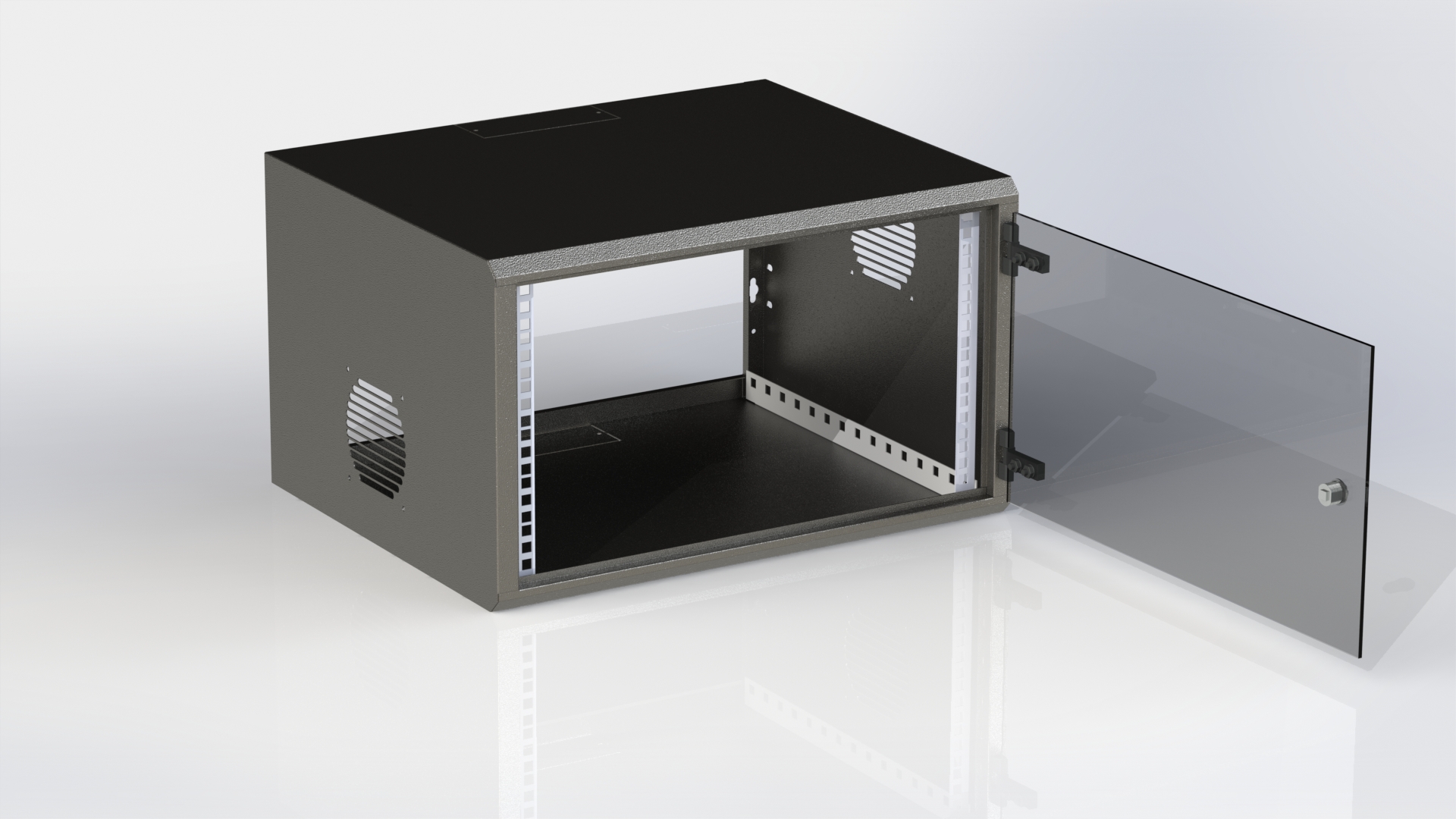Our Wall Boxes are manufactured from cold rolled 1.2mm mild steel and are supplied with the option of a glass or metal door with an opening up to 180° allowing for ease of equipment mounting. The boxes are offered as fixed boxes or with swing frame collars, allowing for rear access wiring and connections. They are supplied powder coated in our standard black or ocean grey colour. Other colours may be requested subject to minimum quantities.